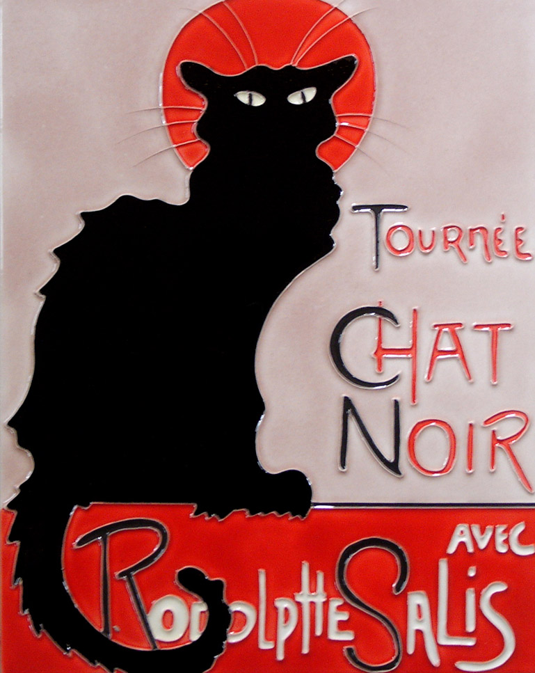 A classic image, this tile is perfect for the kitchen or bathroom. this design is from late 19th century Paris,at the time when artists such as Toulouse Lautrec produced his painting ‘At the Moulin Rouge’. The Chat Noir Cabaret was situated at the foot of MontMartres hill. The tile is inspired by a poster by T.A. Steinlen.Ceramic picture tile, hand painted, complete with black felt backing and hook for hanging, presented in a white gift boxTile Size: 8″ x 12″