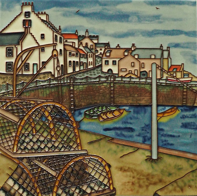 Hand Painted Ceramic Picture Tile of Crail Harbour, Fife, Scotland. This Traditional Fishing Village is now popular with holiday makers and students from St Andrews University. 8″ x 8″