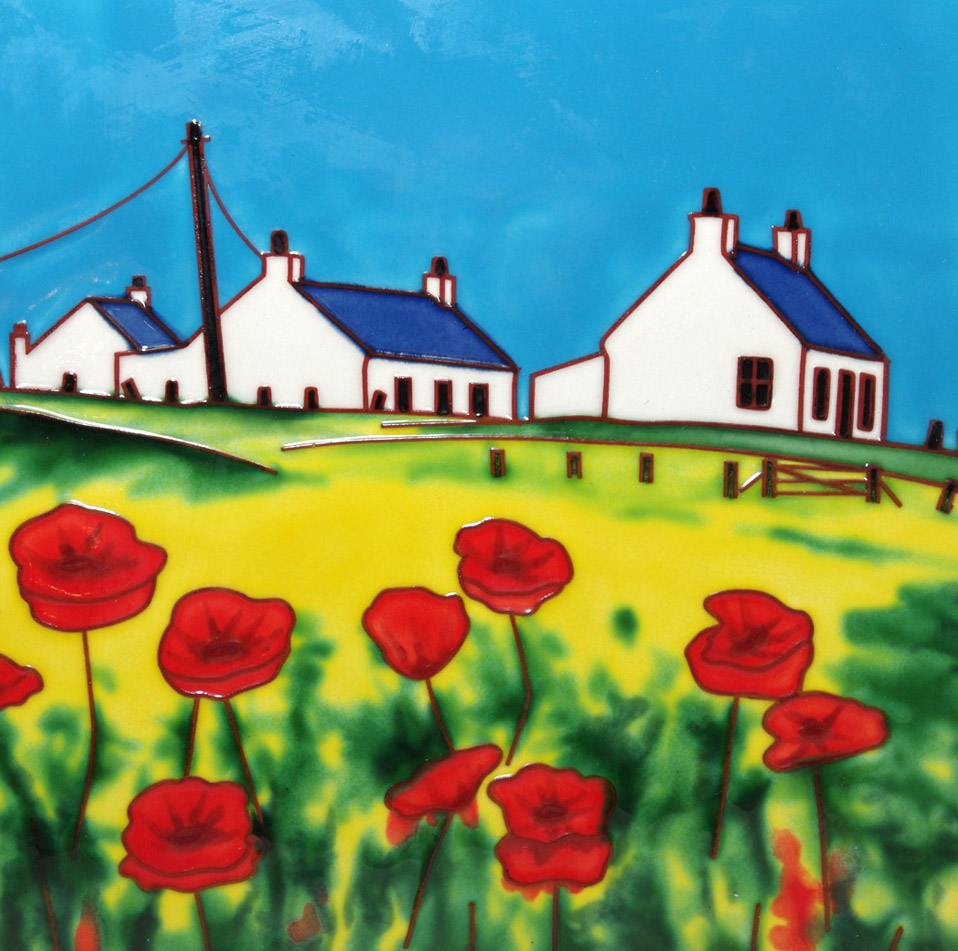 Hand Painted Ceramic Picture Tile – Poppy Field. Wild poppies soaking up the sun on a Scottish hillside. Size 8″ x 8″Artist: Anthony Barber