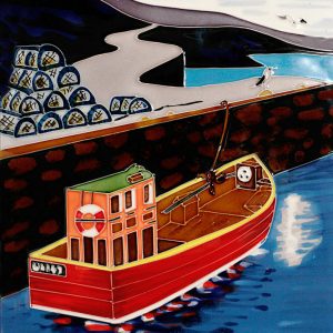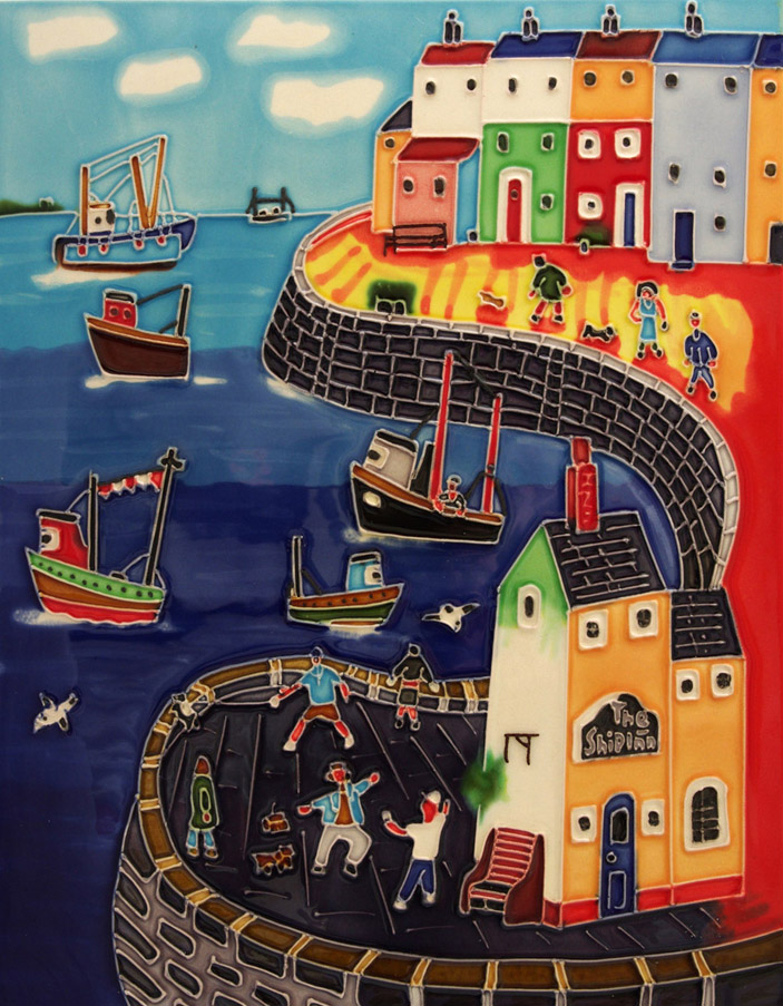 Hand Painted Picture Tile. A beautifully crafted picture of a busy seaside harbour bay with lots going on. This tile has a felt backing with picture hook attached. Delivered in a bespoke white presentation box.Size 11″ x 14″Artist: Graham Round